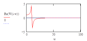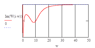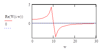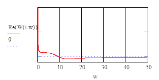 Анализ показывает, что вещественная частотная характеристика постоянно имеет значения очень близкие к 0, начиная с частоты 30 рад/сек. Следовательно ограничимся рассмотрением именно этого частотного диапазона для построения кривой переходного процесса. Итак, частотный диапазон w:=0..30. Найдем значение вещественной части на нулевой частоте так как эта величина есть значение переходного процесса в установившемся режиме.