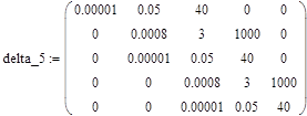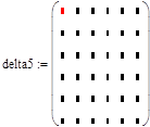 Для вычисления следующего минора delta_5 необходимо скопировать матрицу delta_6 ниже, используя клавиши [F2], [F4], и изменить имя минора на delta_5. Чтобы удалить лишние в этом случае нижнюю строку и правый столбец, необходимо маркер подвести к нижнему правому элементу 1000 и нажать клавиши [Alt]+[M]. Командная строка потребует пояснения для удаления (что будет означать знак -) или дополнения (знак +) текущей матрицы. Необходимо набрать -1 -1 и будет удалена нижняя строка и правый столбец. Выражение примет следующий вид: