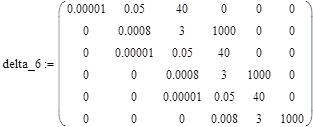 Далее согласно правилу [1-5], необходимо вычислить все главные миноры определителя ГУРВИЦА. Для удобства и простоты общения с MATHCAD, вычислим все миноры, начиная со старшего. Для вычисления определителя матрицы delta_6 необходимо сформировать символ определителя, нажав клавишу [ | ], и заполнить его именем матрицы delta_6. Получим следующий результат: