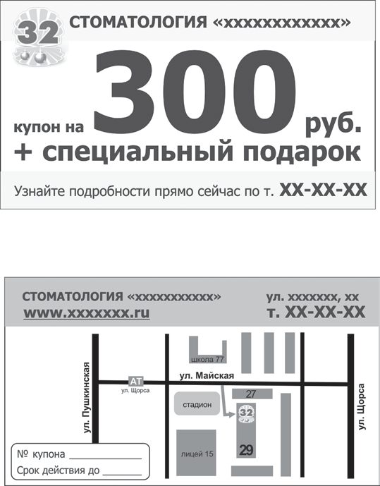 1. При оплате услуг пациентом администратор предлагает порекомендовать нашу клинику. 2. Текст для администратора: «Если вам все понравилось у нас в клинике, пожалуйста, порекомендуйте нас своим родным, друзьям, коллегам. Вам не сложно будет это сделать? Специально для ваших друзей и близких у нас есть купоны на 300 рублей, плюс при первом посещении они получат от нас полезный подарок (это либо ополаскиватель полости рта, либо профессиональная зубная нить). Но и про вас мы не забыли – если к нам приходит человек по вашей рекомендации, то вам на мобильный телефон в этот же день мы зачисляем 100 рублей, и еще 100 рублей добавляем к вашему личному счету у нас в клинике. При следующем посещении вы сможете воспользоваться этими деньгами. Так что помогайте своим друзьям экономить на зубах, а сами говорите по мобильному и лечите зубы бесплатно:‑). Сколько вам дать купонов? (лучше всего дать 2–3 штуки, но можно и больше, по запросу пациента). На каждом купоне указан ваш индивидуальный номер, именно по нему мы определяем, что человек пришел от вас. Обратите внимание, что срок действия купона только 1 месяц! Более того, вы можете делиться этим номером и через социальные сети – купон в принципе не обязателен, можно просто сказать ваш номер – в этом случае ваш друг все равно при первом посещении получит скидку 300 рублей и подарок от нас, а вы – соответствующие бонусы. Объяснение, почему мы это делаем: Благодаря тому, что наши клиенты активно рекомендуют нас своим друзьям и большинство наших клиентов приходят именно по рекомендациям – мы практически не тратимся на рекламу! Именно поэтому у нас цены ниже среднего по городу, плюс мы постоянно проводим различные акции, очень выгодные для наших клиентов. Так что все это благодаря вашим рекомендациям:‑). Учет рекомендаций и ведение внутренних счетов клиентов: