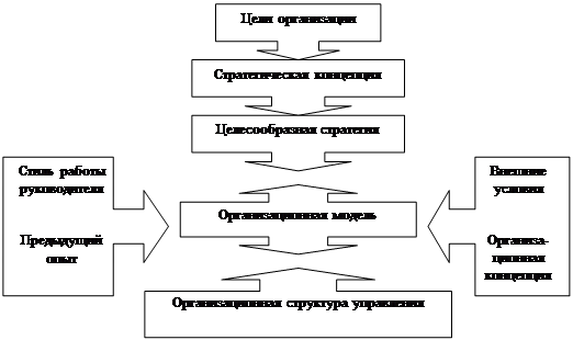 Рисунок 1.1 - Переход от целей организации к ее структуре [13, с.12] Взаимосвязь основных видов структур представлена на рисунке 1.2. Социальная структура характеризуется распределением работников по предприятиям по профессионально-квалификационному, половозрастному, национальному составу, уровню образования. Информационная структура - совокупность правил, технических средств и коммуникационных сетей, определяющих целенаправленное использование информации как ресурса. Эффективная информационная структура должна обеспечить планирование, организацию, координацию и контроль информационных процессов по всем трем фазам (поиск, обработка и распределение информации) как на стратегическом, так и на тактическом и