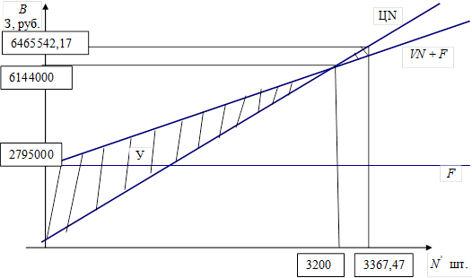 Рисунок – График безубыточности 1го изделия (В – выручка, руб.; З – затраты, руб.; F – постоянные затраты, руб.; У – убыток, руб.; V – переменные затраты, руб./шт.; Ц – цена, руб./шт.)