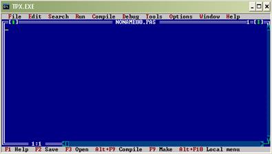 Работа в среде программирования Turbo Pascal начинается с загрузки её в память компьютера. Система Турбо Паскаль довольно значительна по объему. Она поставляется на нескольких дистрибутивных дискетах и устанавливается на жесткий диск. При развертывании системы на жестком диске обычно создается отдельный каталог с именем ТР (или PAS, TURBOPAS, PASCAL и т.п.), в который помещаются все файлы с дистрибутивных дискет. Для вызова Турбо Паскаля необходимо отыскать в древовидной структуре каталогов ПК этот каталог и в нем файл с именем TURBO.EXE. Этот файл содержит готовую к работе диалоговую систему программирования Турбо Паскаль. В него входят минимально необходимые части Турбо Паскаля (текстовый редактор, компилятор, компоновщик, загрузчик). Для нормальной работы в диалоговой среде понадобятся также основная библиотека, располагающаяся в файле TURBO.TPL, и справочная служба (файл TURBO.HLP). В принципе, этих файлов достаточно для написания, компиляции и исполнения большинства примеров. Пусть перечисленные файлы располагаются в каталоге ТР на диске D. Тогда для вызова Турбо Паскаля следует дать команду D:\TP\TURBO Для запуска Turbo Pascal необходимо перейти на диск в каталог с системой Turbo Pascal и дважды щёлкнуть по файлу Turbo.exe. После загрузки на экране появится окно редактирования Turbo Pascal.