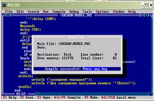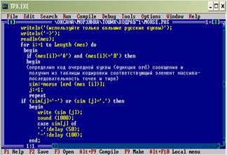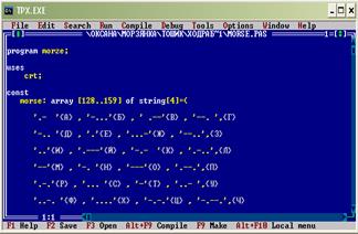 Программа написана на языке Turbo Pascal. Этот язык представляет мощное инструментальное средство написания прикладных программ, которое можно использовать в реальной работе. Turbo Pascal является средой разработки Программного Обеспечения фирмы Borland. ПО в среде Turbo Pascal реализуется на процедурно- ориентированном языке Паскаль. Расширение языка Turbo Pascal предоставляет все возможности объектно-ориентированного программирования: наибольшую структурность, абстрактность, модульность, встроенные непосредственно в язык. В Delphi упор ставится на написание ПО под Windows, много возможностей и легко запутаться. Программы, разработанные на TURBO Pascal, компактны, и занимают мало места на жестком диске. Современные технологии программирования, такие как Delphi, в буквальном смысле слова ”стоят на плечах” TP. Неизвестно что и когда может пригодиться в жизни. Азбука Морзе широко используется на международном уровне. Ознакомившись с программой, пользователь, возможно, заинтересуется данной системой передачи сигналов, и в дальнейшем захочет знать и применять код Морзе.