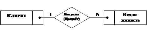 Нормализация – это разбиение таблицы на две или более, обладающих лучшими свойствами при включении, изменении и удалении данных. Окончательная цель нормализации сводится к получению такого проекта базы данных, в котором каждый факт появляется лишь в одном месте, т.е. исключена избыточность информации. Это делается не столько с целью экономии памяти, сколько для исключения возможной противоречивости хранимых данных. На использовании разновидностей ER-модели основано большинство современных подходов к проектированию баз данных (главным образом, реляционных). Модель была предложена Ченом (Chen) в 1976 г. Моделирование предметной области базируется на использовании графических диаграмм, включающих небольшое число разнородных компонентов. В связи с наглядностью представления концептуальных схем баз данных ER-модели получили широкое распространение в системах CASE, поддерживающих автоматизированное проектирование реляционных баз данных. Среди множества разновидностей ER-моделей, одна из наиболее развитых применяется в системе CASE фирмы ORACLE. Преимущество ER-диаграмм в том, что они позволяют наглядно представить взаимосвязь объектов предметной области и при этом нет необходимости в манипулировании множеством атрибутов при нормализации, как это имеет место в методе декомпозиции. Ключевыми для данного метода являются понятия сущность и связь. Сущность – это реальный или представляемый объект, информация о котором должна сохраняться и быть доступна. В диаграммах ER-модели сущность представляется в виде прямоугольника, содержащего имя сущности. При этом имя сущности - это имя типа, а не некоторого конкретного экземпляра этого типа. Для большей выразительности и лучшего понимания имя сущности может сопровождаться примерами конкретных объектов этого типа. Связь – это графически изображаемая ассоциация, устанавливаемая между двумя сущностями. Эта ассоциация всегда является бинарной и может существовать между двумя разными сущностями или между сущностью и ей же самой (рекурсивная связь). В любой связи выделяются два конца (в соответствии с существующей парой связываемых сущностей), на каждом из которых указывается имя конца связи, степень конца связи (сколько экземпляров данной сущности связывается), обязательность связи (класс принадлежности) т.е. любой ли экземпляр данной сущности должен участвовать в данной связи. Для применения метода ER-диаграмм необходимо определить сущности, которые являются необходимыми (стержневыми) для проектируемой базы данных, а также их ключевые атрибуты. После этого строятся ER-диаграммы. Затем согласно степени связи и класса принадлежности объекта строятся отношения, которые необходимо проверить на соответствие 3НФ. Если хотя бы одно полученное отношение не удовлетворяет требованиям 3НФ, то необходимо пересмотреть ER-диаграмму, соответствующую этому отношению. Используя вышеописанные правила, применим метод ER-диаграмм для нормализации исходного универсального отношения. Исходя из описания предметной области, можно выделить, 3 стержневые сущности: Клиент (физическое лицо), Клиент (юридическое лицо), Недвижимость (Объект продажи-покупки). Анализ отношений между атрибутами вышеперечисленных объектов, позволяет выделить следующие функциональные зависимости между атрибутами соответствующи