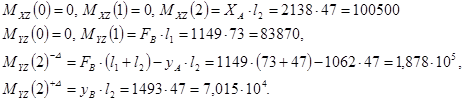 На расчетной схемах в горизонтальной плоскости XZ действуют сила Ft и опорные реакции ХА ,ХВ , в вертикальной плоскости YZ -