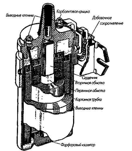 Катушка зажигания служит для преобразования тока низкого напряжения в ток высокого напряжения (с 12 В до 20—24 тыс. В). Она состоит из следующих основных частей (рис. 1): сердечника, первичной обмотки из толстого изолированного провода диаметром 0,8 мм, картонной трубки, вторичной обмотки, состоящей из 18—20 тыс. витков тонкого провода, железного корпуса с магнитопроводами, карболитовой крышки, клемм и дополнительного сопротивления. Вторичная обмотка изолирована от первичной слоем изоляции. Концы первичной обмотки выведены на клеммы карболитовой крышки. Один конец вторичной обмотки соединен с первичной обмоткой, а второй выведен на центральную клемму карболитовой крышки. Сердечник изготовляют из отдельных изолированных друг от друга полосок трансформаторной стали, чтобы не допустить образования вихревых токов. Нижний конец сердечника установлен в фарфоровый изолятор. Внутри катушка заполнена трансформаторным маслом. Добавочное сопротивление состоит из спирали, керамических гнезд и двух шин. Величина сопротивления колеблется от 0,7 до 4 Ом. Один конец соединен шиной с клеммой ВК, а другой с клеммой ВК-Б. На малых оборотах коленчатого вала двигателя контакты прерывателя сравнительно продолжительное время находятся в замкнутом состоянии, сила тока в первичной цепи возрастает, сопротивление нагревается, увеличивается сопротивление в цепи, в катушку зажигания поступает ток небольшой величины, этим она предохраняется от перегрева.