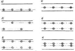 Рис. 5. Схемы размещения фонарей на улицах: а – односторонняя; б – двухрядная в шахматном порядке; в-двухрядная прямоугольная; г – осевая; д – двухрядная прямоугольная по осям движения; е– двухрядная прямоугольная по оси улицы