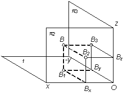 Пример построения третьей проекции точки по двум заданным Точка в пространстве определяется любыми двумя своими проекциями. При необходимости построения третьей проекции по двум заданным необходимо воспользоваться соответствием отрезков линий проекционной связи, полученных при определении расстояний от точки до плоскости проекций (см. рис. 2.27 и рис. 2.28).