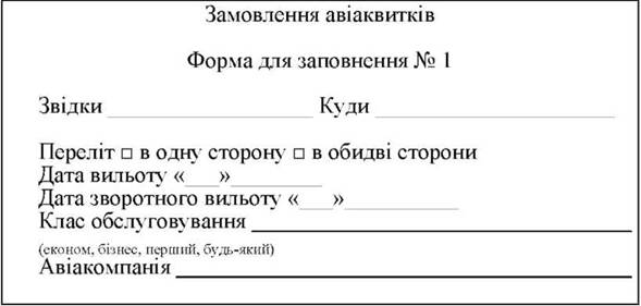 * Можливі варіанти умов проживання (класи номерів) за міжнародним стандартом: - DS (Diplomatic Suite) - апартаменти; - OBS (One Bedroom Suite) - однокімнатний люкс; - Std - стандарт; - OV (Ocean View) - вид на море. ** Можливі варіанти умов харчування за міжнародним стандартом: - HB - напівпансіон; - BB - пансіон; - OB - без харчування; - HB-lanch - сніданок + обід; - HB-dinner - сніданок + вечеря; - AI - все включено. 7.2. Ознайомитися з особливостями надання послуг з бронювання квитків Вказівки до виконання завдання 1. На головній сторінці сайту-каталогу туристичних агентств, компаній та фірм Києва та України (turne.com.ua) у системному меню обрати розділ "Ж/д, авиа, автобус". 2. У підрозділі "Он-лайн бронирование" обрати розділ "Заказ авиабилетов" та ознайомитися з формою для заповнення при замовленні квитків. Остання може містити дані про місце вильоту, місце прибуття, тип перельоту (в обидва кінці, в одну сторону), дату вильоту (у режимі день-місяць), дату зворотного вильоту (у режимі день-місяць для перельоту в обидва кінці), клас обслуговування, назву авіакомпанії, кількість пасажирів. Результати подати у вигляді форми для замовлення квитків: