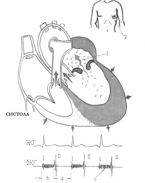 Рис. 27.Органический шум при недостаточности митрального клапана (1-турбулентный ток крови; 2-локализация шума; 3-систола; 4-диастола; 5-лентовидный систолический шум).
