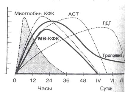 Рис. 32. Динамика активности в крови кардиоспецифических ферментов у больного после инфаркта миокарда.
