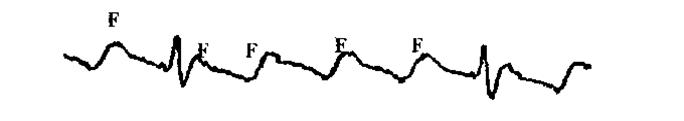 4. частота сокращения предсердий > 360 в минуту, частота сокращения желудочков: < 60 - при брадисистолической форме фибрилляции предсердий; 60-90 - при нормосистолической; > 90 –при тахисистолической. Рис. 42. ЭКГ при фибрилляции предсердий. Трепетание предсердий - частое (220 - 360 в минуту) ритмичное сокращение предсердий. ЭКГ - признаки (рис. 43): 1. отсутствие Р, вместо него - волны F, часто пилообразной формы, одинаковые между собой; 2. расстояния между вершинами предсердных волн одинаковы - правильный предсердный ритм; 3. желудочковый ритм чаще регулярный;