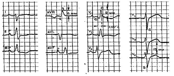 В противоположность блокадам проведение импульсов может быть ускоренным - развивается феномен преждевременного возбуждения желудочков: WPW, CLC, при которых импульс от предсердий к желудочкам идет минуя a-v узел, по дополнительным аномальным путям: пучкам Кента, Джеймса. Основной ЭКГ - признак при этом - укорочение PQ < 0,12" и Δ-волна в начальной фазе зубца R 4.3.2. ГИПЕРТРОФИИ ЖЕЛУДОЧКОВ И ДИЛАТАЦИИ ПРЕДСЕРДИЙ ЭКГ-признаки гипертрофии любого отдела сердца обусловлены: 1. увеличением эл. активности гипертрофированного отдела, что проявляется нарастанием амплитуды зубца, который несет информацию о данном отделе; 2. замедлением проведения по нему эл. импульса, о чем свидетельствует расширение зубца Р или комплекса QRS, а также увеличение времени внутреннего отклонения (отрезок от начала QRS до вершины зубца R); 3. ишемическими, метаболическими изменениями, проявляющимися нарушениями процесса реполяризации желудочков и инверсией зубца Т.