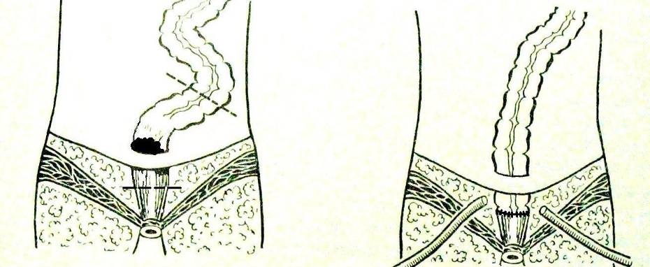 Рис. 56. Брюшно-анальная резекция прямой кишки с низведением сигмовидной В.Д. Федоров, 1987г.