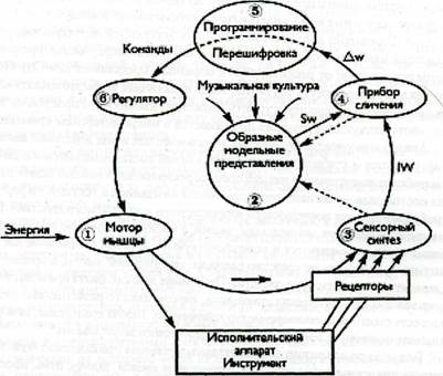 При описании механизмов освоения двигательного акта воспользуемся блок-схемой управления движениями Н. А. Бернштейна (см. рис.1). Некоторые компоненты блок-схемы адаптированы к музыкально-исполнительскому процессу. Изменения коснулись определения «программы» и содержания «задающего прибора». «Программа» трактуется нами как «музыкальная культура» во всех ее связях и проявлениях. «Задающий прибор» включает в себя содержание «программы» и наделен функциями идеальных музыкально-образных слуховых представлений исполнителя. Внесенные изменения, по сути, не искажают смыслового содержания представленной блок-схемы, в то же время позволяют рассматривать схему не как закрытую систему, благодаря включению понятия «музыкальная культура», как открытую систему с кольцевым функционированием. Все это, с одной стороны, ближе к исполнительской практике музыканта, с другой стороны, соответствует современным представлениям о развитии двигательных навыков. Исполнительские действия, направленные на приобретение и развитие двигательных навыков, имеют следующий вид. Музыкально-образные слуховые представления черпают свое содержание из внешнего мира и, прежде всего, из всего того многообразия, которое составляет понятие музыкальная культура. Основным содержанием слуховых представлений является эмоциональная, двигательная, образная, словесно-логическая память обо всех событиях, действиях прошлого и настоящего. В процессе принятия решения о выполнении определенного действия, направленного на получения необходимого звукового результата, в слуховом представлении (2) на основе прошлого опыта