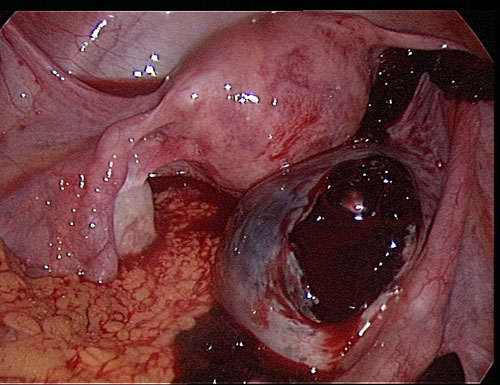 аналық бездің апоплексиясы кезіндегі лапаротомия жасағандағы көрініс Лапаротомияға көрсеткіш: § Құрсақ қуысына қан кету науқастың аурыр жағдайымен көрінетін болса (геморрагиялық шок); § Лапароскопияны жүргізу мүмкін болмаса (қан кетудің күшеюі, жабысқан процесс);