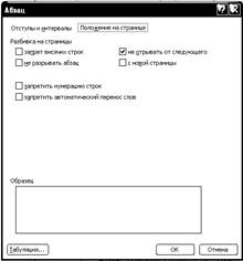 Рисунок 7 – Диалоговое окно «Абзац» (Вкладка Отступы и интервалы) - в диалоговом окне «Абзац» (Вкладка Отступы и интервалы) установить следующее: Общие: Выравнивание: По ширине Уровень: Основной текст Отступ: Слева: 0 см Справа: 0 см Отступ: первая строка ðОтступ на: 1,25 см Интервал: Перед: 0 см После: 0 см Интервал: междустрочный: Полуторный Не добавлять между абзацами одного стиля: убрать флажок - в диалоговом окне «Абзац» (Положение на странице) установить флажок не отрывать от следующего, остальные флажки убрать (рисунок 8).