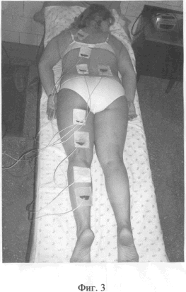 В современной вертеброневрологии широко применяются способы лечения неврологических проявлений остеохондроза позвоночника с использованием разнообразных методов физиотерапии (Гурленя A.M. Физиотерапия и курортология нервных болезней. /A.M.Гурленя, Г.Е.Багель. - Минск: Вышэйшая школа, с.166). Как правило, при купировании острых соматогенных и нейрогенных болевых синдромов используются низкочастотных импульсных токи (синусоидальные модулированные, диадинамические, флюктуирующие, интерференционные и т.д.) (Боголюбов В.М. Общая физиотерапия: Учебник. /В.М.Боголюбов, Г.Н.Пономаренко. - 3-е изд., перераб. и доп.- Москва: Медицина, 1999. с.102). Используется стандартный метод лечения синусоидальными модулированными токами (СМТ). СМТ подводят к телу пациента по обычным электродам с гидрофильными прокладками. Размеры электродов должны соответствовать зоне боли или патологического очага. Лечение болей обычно проводят по схеме: режим переменный, род работы (РР) - III, частота модулирующего тока (ЧМ) - 100 Гц, глубина модуляции (ГМ) - 75%, длительность посылок - 2-3 сек, 3-5 минут; род работы - IV, частота - 70 Гц, глубина модуляции - 75-100%, длительность посылок - 3 сек, 3-5 мин (Боголюбов В.М. Общая физиотерапия: Учебник. /В.М.Боголюбов, Г.Н. Пономаренко. - 3-е изд., перераб. и доп. - Москва: Медицина, 1999. - с.100). Недостатки способа. Лечебное воздействие проводится лишь на область непосредственных болевых проявлений, которая не всегда соответствует локализации патоморфологического субстрата. Способ не учитывает рефлекторных патобиомеханических и миодискоординаторных расстройств, возникающих в отдаленных и смежных от очага первичного поражения регионах тела. Для лечения остеохондроза позвоночника используется и лечение ультразвуковой терапией. Лечебное воздействие проводят либо на область болевых проявлений - паравертебральные зоны позвоночника, либо по ходу пораженных нервных стволов. Интенсивность ультразвука варьирует 0,05-0,4 Вт/см 2. Режим регенерации используют импульсный, как более щадящий. Применяется для воздействия на сегменты и в острый период заболевания. Продолжительность воздействия на одно поле - от 1 до 3-5 мин. Курс лечения состоит из 10-15 процедур, проводимых ежедневно или через день. (Боголюбов В.М. Общая физиотерапия: Учебник. /В.М.Боголюбов, Г.Н.Пономаренко. - 3-е изд., перераб. и доп. - Москва: Медицина, 1999. - с.208). Недостатки способа. Способ не учитывает рефлекторных патобиомеханических и миодискоординаторных расстройств, возникающих в отдаленных и смежных от очага первичного поражения регионах тела. Наиболее близким является способ комплексной реабилитации при патологии опорно-двигательного аппарата (Петров К.Б. «Способ комплексной реабилитации при патологии опорно-двигательного аппарата» патент РФ №2164128, М.Кл. А 61 Н 39/04, 1/00; опубликованный в БИМП №8, 2001 г.). В результате проведенных клинических, электромиографических, нерофизиологических, биофизических, биомеханических и статистических исследований была выделена группа клинико-патогенетических феноменов, названных неспецифическими рефлекторно-мышечными синдромами (НРМС) и определенными как закономерное перераспределение мышечного тонуса на туловище и конечностях, возникающее в ответ на раздражение рецепторов мышечно-скелетной системы, а также связанных с ней структур, независимо от локализации и 