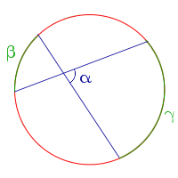 | Величина угла, образованного пересекающимися хордами, равна половине суммы величин дуг, заключённых между его сторонами.