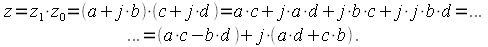 Для того чтобы получить формулу для умножения комплексных числен необходимо перемножить два комплексных числа по правилу умножения многочленов: