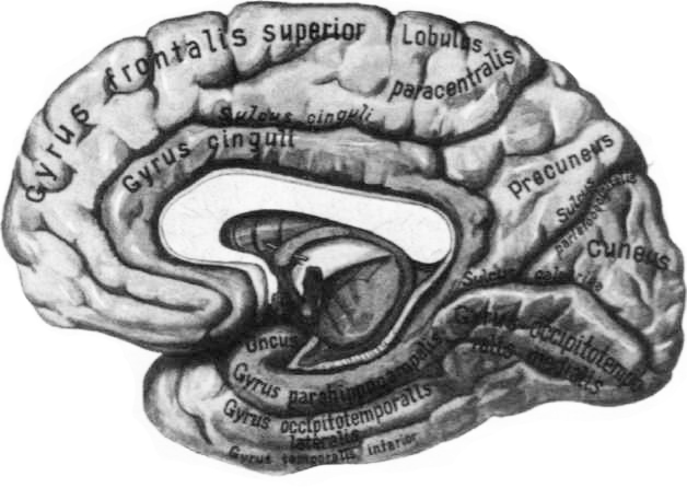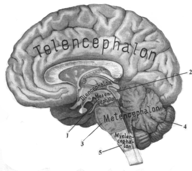 Отделы головного мозга: 1 - ножка мозга; 2 - пластинка крыши среднего мозга; 3 - мост; 4 - мозжечок; 5 - продолговатый мозг. Полушария головного мозга соединены между собой спайками, наибольшей из которых является мозолистое тело (corpus callosum). На каждом полушарии различают три поверхности: верхнебоковую, внутреннюю (медиальную) и нижнюю, и три полюса - лобный, затылочный и височный. Все поверхности полушарий покрыты слоем серого вещества, представляющего собой преимущественно тела нервных клеток - это кора большого мозга (cortex). Кора мозга исчерчена большим количеством борозд (sulci), между которыми находятся извилины (gyri). Самые глубокие борозды делят каждое полушарие на доли - лобную, височную, теменную, затылочную, островковую и лимбическую (lobi frontalis, temporalis, perietalis, occipitalis, insularis et limbicus). На выпуклой верхнебоковой поверхности каждого полушария находится самая глубокая и наибольшая борозда этой поверхности - боковая, или сильвиева (sulcus lateralis). Дно этой борозды широкое и образует особенную долю полушария головного мозга - островковую, или островок (insula). Она прикрыта частями лобной, теменной и височной долей, которые образуют покрышку (operculum). Боковая борозда отграничивает сверху височную долю, отделяя ее впереди от лобной, сзади от теменной. Вторая большая борозда на верхнебоковой поверхности полушария - центральная, или роландова (sulcus centralis). Она проходит вниз и вперед, немного не доходя к боковой борозде и отграничивает лобную долю от теменной. Эта борозда заходит и на внутреннюю поверхность полушария.