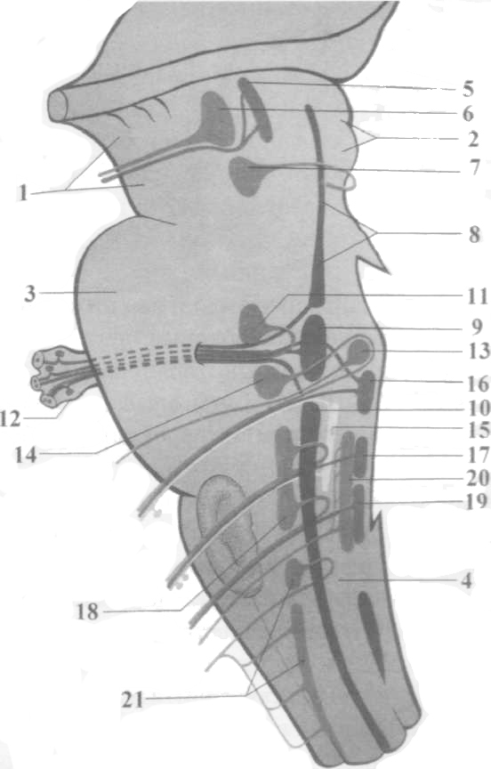 Ствол головного мозга. Схема расположения ядер черепных нервов: 1 - ножка мозга; 2 - пластинка крыши среднего мозга; 3 - мост; 4 - продолговатый мозг; 5 - парасимпатические ядра глазодвигательного нерва; 6 - соматические двигательные ядра глазодвигательного нерва; 7 - ядро блокового нерва; 8 - ядро среднемозгового пути тройничного нерва; 9 - верхнее чувствительное ядро тройничного нерва; 10 - спинномозговое ядро тройничного нерва; 11 - двигательное ядро тройничного нерва; 12 - узел тройничного нерва; 13 - ядро отводящего нерва; 14 - ядро лицевого нерва; 15 - ядро одиночного пути (вкусовое); 16 - верхнее слюноотделительное ядро; 17 - нижнее слюноотделительное ядро; 18 - двойное ядро; 19 - парасимпатическое ядро блуждающего нерва; 20 - ядро подъязычного нерва; 21 - ядро добавочного нерва. Средний мозг (mesencephalon) имеет длину около 1 см и состоит из двух ножек мозга (pedunculi cerebri) и пластинки четверохолмия. На основании мозга его ножки в виде двух толстых тяжей выходят из-под верхнего края моста и, разойдясь в стороны, заходят в полушарие мозга. Между височной долей и ножкой мозга выходит корешок IV пары черепных нервов. Между ножками мозга находится межножковая ямка (fossa interpeduncularis), в которой находятся корешки III пары черепных нервов. Через основание среднего мозга проходят эфферентные пути от полушарий к нижерасположенным структурам центральной нервной системы. Часть корково-ядерных путей заканчивается в ядрах III и IV пар черепных нервов, находящихся в покрышке ножек мозга (tegmentum pedunculi). Впереди от ядер III пары черепных нервов расположены ядро медиального продольного пучка (ядро Даркшевича) и промежуточное ядро (ядро Кахаля). От них начинаются нисходящие волокна медиального продольного пучка (fasciculus longitudinalis medialis seu posterior), принимающего участие в иннервации взора. Наибольшим из ядер покрышки среднего мозга является красное ядро (nucleus ruber), которое многими путями связано с различными структурами центральной нервной системы. Между покрышкой и основанием ножки размещается черное вещество (substania nigra), относящееся к филогенетически старому отделу экстрапирамидной системы. Дорсальнее над покрышкой расположена крыша среднего мозга в виде пластинки четверохолмия, на которой находятся два верхних бугорка (colliculi superiores) и два нижних (colliculi inferiores), представляющие соответственно подкорковые центры зрения и слуха. Под крышей расположен водопровод мозга, который является полостью среднего мозга и связывает между собой III и IV мозговые желудочки. Под его дном на уровне верхних бугорков пластинки четверохолмия располагаются ядра III пары черепных нервов, на уровне нижних бугорков - ядра IV пары. Каждый бугорок при помощи ручки верхнего бугорка (brachium colliculi superioris) и ручки нижнего бугорка (brachium colliculi inferioris) соединен соответственно с наружным и внутренним коленчатыми телами промежуточного мозга. От ядер нижних бугорков к передним рогам спинного мозга и мотонейронам ядер черепных нервов проходят соответственно покрышечно-спинномозговой путь (tractus tectospinalis) и покрышечно-ядерный путь (tractus tectobulbaris), обеспечивающие возможность защитных зрительных и слуховых рефлексов. Мост (pons) снизу ограничен продолговатым мозгом, сверху с помощью верхних мозжечковых ножек соединяется со средним мозгом. Мост разделяется на вентральную (basis) и дорсальную (pars dorsalis seu tegmentum pontis) части. В основании моста проходят продо
