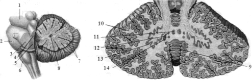 Мозжечок: 1 - средний мозг; 2 - мост; 3 - средняя ножка мозжечка; 4 - верхняя ножка мозжечка; 5 - нижняя ножка мозжечка; 6 - продолговатый мозг; 7 - кора мозжечка; 8 - ядра мозжечка; 9 - червь; 10 - полушарие мозжечка; 11 - ядро шатра; 12 - шаровидное ядро; 13 - зубчатое ядро; 14 - пробковидное ядро Под затылочными долями полушарий в задней черепной ямке располагается наибольший отдел ромбовидного мозга - малый мозг, или мозжечок (cerebellum). В мозжечке различают тело мозжечка и клочково-узелковую дольку. Тело мозжечка имеет два полушария (hemispherii cerebelli) и червь (vermis), которые тремя парами мозжечковых ножек (pedunculi cerebellaris) соединяются с другими отделами мозга (рис 7). Червь мозжечка (palaeocerebellum) - филогенетически древнее образование, а полушария мозжечка (neocerebellum) - филогенетически молодые структуры. Средние ножки соединяют мозжечок с мостом, верхние - с красными ядрами в среднем мозге, нижние - с продолговатым мозгом. Мозжечок покрыт твердой мозговой оболочкой в виде мозжечкового намета (tentorium cerebelli), который отделяет его от затылочных долей мозга. Червь и полушария мозжечка глубокими поперечными бороздами разделяются на дольки, наибольшими из которых являются задняя и передняя. Глубокие щели делят мозжечок на дольки, среди которых различают клочок (flocculus) и узелок (nodulus), образующие клочково-узелковую долю. Мозжечок состоит из серого и белого вещества. Серое вещество образует кору мозжечка, покрывающую полушария, и парные ядра, находящиеся в глубине. Наибольшие из них - зубчатые ядра (nuclei dentati), расположенные в полушариях мозжечка. Продолговатый мозг (myelencephalon seu medulla oblongata) имеет длину 2,5-3 см, является продолжением спинного мозга и сохраняет особенности его строения. Он имеет коническую форму, поэтому ранее его называли луковицей (bulbus). На передней (вентральной) поверхности продолговатого мозга находится передняя срединная щель (fissura mediana anterior), являющаяся продолжением одноименной щели спинного мозга. По обе стороны от нее располагаются два возвышения - пирамиды (pyramides), образованные двигательными корково-спинномозговыми (пирамидными) путями, большая часть которых на границе продолговатого мозга со спинным мозгом в глубине передней срединной щели осуществляет перекрест (decussatio pyramidum). Кзади с обеих сторон от пирамид находится парная передняя боковая борозда (sulcus lateralis anterior), из которой выходят передние корешки CI сегмента спинного мозга и корешки подъязычного нерва, и задняя боковая борозда (sulcus lateralis posterior), из которой выходят корешки блуждающего, языкоглоточного и добавочного нервов. Между пирамидой и передней боковой бороздой находится нижняя олива (oliva inferior). Большую часть задней (дорсальной) поверхности продолговатого мозга образует нижний треугольник дна четвертого желудочка, имеющего форму ромба и называемого ромбовидной ямкой. Верхний треугольник ромбовидной ямки находится в пределах моста. На дорсальной поверхности каудальной части продолговатого мозга находятся два парных бугорка - тонкий и клиновидный (tuberculum gracile et cuneatum), в которых заканчиваются одноименные восходящие пучки, проводящие импульсы глубокой чувствительности по задним канатикам спинного мозга. Дорсально в белом веществе продолговатого мозга проходит задний продольный пучок (fasciculus longitudinalis dorsalis), образованный волокнами, соединяющими между собой гипоталамус, верхние бугорки пластинки четвер