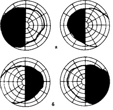 Схема зрительного анализатора: 1 - поля зрения; 2 - зрительный нерв; 3 - зрительный перекрест; 4 - зрительный путь; 5 - наружное коленчатое тело; б - верхние холмики крыши среднего мозга; 7 - подушка таламуса; 8 - зрительная лучистость; 9 - корковый отдел зрительного анализатора; 10 - добавочное ядро глазодвигательного нерва; 11 - парасимпатические волокна глазодвигательного нерва; 12 - ресничный узел. После зрительного перекреста образуются правый и левый зрительные пути (tracti optici), каждый из которых содержит волокна от обоих глаз - не перекрещенные волокна со своей стороны и перекрещенные от противоположного глаза, т. е. волокна от одноименных половин сетчатки обоих глаз (правых или левых). Каждый зрительный путь направляется кзади и кнаружи, огибает ножку мозга и заканчивается двумя пучками в подкорковых зрительных центрах: первый пучок в наружном коленчатом теле и подушке таламуса, второй - в верхнем бугорке пластинки четверохолмия среднего мозга. В подкорковых зрительных центрах расположены нейроны, аксоны которых дальше идут разными путями. От наружного коленчатого тела и подушки таламуса зрительные волокна проходят через заднюю ножку внутренней капсулы и далее, разойдясь веером, образуют зрительную лучистость (пучок Грасиоле). Волокна зрительной лучистости направляются через глубинные отделы височной и частично теменной долей к коре внутренней поверхности затылочной доли, где в цитоархитектоническом поле 17 расположен корковый отдел зрительного анализатора. К нему принадлежат шпорная борозда и находящиеся по бокам от нее извилины: сверху - клин (cnneus), снизу - язычная извилина (gyrus lingualis), в которых и заканчиваются волокна от одноименных половин сетчатки обоих глаз. Импульсы от этого участка поступают в 18 и 19 корковые поля наружной поверхности затылочной доли, где происходит анализ и синтез сложных зрительных изображений, и узнавание увиденного. Волокна зрительного пути, идущие к верхнему бугорку пластинки крыши среднего мозга, принимают участие в образовании рефлекторной дуги зрачкового рефлекса (сужение зрачков при освещении глаз). Световые раздражения, попадающие на сетчатку, сначала направляются по афферентной части рефлекторной дуги, которую составляют зрительный нерв и зрительный путь, к верхнему бугорку пластинки крыши. Далее через вставочный нейрон они поступают к парасимпатическим ядрам глазодвигательных нервов (ядрам Якубовича) своей и противоположной стороны (см. рис. 43). От этих ядер по эфферентной части рефлекторной дуги в составе глазодвигательного нерва, проходя через ресничный узел, импульсы достигают мышцы, суживающей зрачок (m. sphincter pupillae). Так как зрительные волокна соединены с парасимпатическим ядром не только своей стороны, но и противоположной, при освещении одного глаза возникает сужение обоих зрачков. Сужение зрачка освещаемого глаза носит название прямой реакции зрачка на свет. Одновременное сужение зрачка неосвещенного глаза называется содружественной реакцией зрачка на свет. Поражение различных отделов зрительного анализатора клинически проявляется по-разному. Полное повреждение зрительного нерва травматической, ишемической, воспалительной или другой этиологии приводит к потере зрения на этот глаз (амавроз), что сопровождается выпадением прямой (поскольку прерывается афферентная часть 