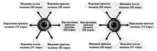 Глазное дно: а - в норме; б - застойный диск зрительного нерва; в - первичная атрофия диска зрительного нерва. Состояние диска зрительного нерва изучают, осматривая глазное дно с помощью офтальмоскопа. В норме диск зрительного нерва круглый, с четкими границами, бледно-розового цвета. От центра диска радиально отходят веточки центральной артерии сетчатки и сходятся в его центре вены сетчатки. Соотношение диаметра артерий и вен составляет 2:3. При поражении аксонов ганглиозных клеток сетчатки на любом промежутке (зрительный нерв, зрительный перекрест или зрительный путь) спустя некоторое время происходит дегенерация этих волокон и возникает атрофия диска зрительного нерва, которая носит название первичной. В таких случаях диск становится бледным, серебристо-белым. При повышенном внутричерепном давлении (большей частью при локализации опухоли в задней черепной ямке) возникает отек дисков зрительных нервов в виде застойных дисков (см. рис. 50). Застойный диск увеличен в объеме, границы его нечеткие, диск выступает в стекловидное тело, артерии сужены, вены расширены. Если причина гипертензивного синдрома не ликвидируется, застой дисков зрительных нервов с течением времени переходит в их вторичную атрофию. Нервы глазодвигательной группы (глазодвигательный, блоковый, отводящий) Нервы, которые иннервируют мышцы, поворачивающие глазные яблоки, относятся к группе глазодвигательных. Это - глазодвигательный (III пара), блоковый (IV пара) и отводящий (VI пара) нервы. Движения глазного яблока в стороны обеспечивают его наружные поперечно-полосатые мышцы - верхняя, нижняя, внутренняя и наружная прямые, верхняя и нижняя косые. Верхняя косая мышца, которая поворачивает глазное яблоко вниз и несколько кнаружи, иннервируется блоковым нервом; наружная прямая мышца, поворачивающая глаз кнаружи, отводящим; остальные мышцы - глазодвигательным нервом, который в основном обеспечивает движения глазного яблока вверх, кнутри и книзу. Схема движений глазных яблок при сокращении их поперечно-полосатых мышц приведена на рисунке.