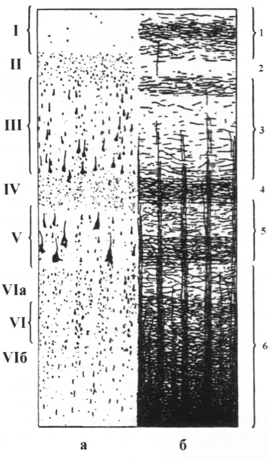 Структура коры большого мозга: а - слои клеток; б - слои волокон; I - молекулярная пластинка; II - внешняя зернистая пластинка; III - внешняя пирамидная пластинка; IV - внутренняя зернистая пластинка; V - внутренняя пирамидная (ганглиозная) пластинка; VI - мультиформная пластинка (Via - клетки треугольной формы; VIб - клетки веретенообразной формы) Морфологическое строение коры большого мозга в разных его участках подробно было описано профессором Киевского университета И.О. Бецом в 1874 г. Он впервые описал гигантские пирамидные клетки в пятом слое коры прецентральной извилины. Эти клетки известны как клетки Беца. Аксоны их направляются к моторным ядрам ствола головного и спинного мозга, образуя пирамидный путь. В.О. Бец впервые ввел термин «цитоархитекто-ника коры». Это наука о клеточном строении коры, количестве, форме и расположении клеток в разных ее слоях. Цитоархитекто-нические особенности строения разных участков коры большого мозга являются основой распределения ее на области, подобласти, поля и подполя. Отдельные поля коры отвечают за определенные проявления высшей нервной деятельности: речь, зрение, слух, обоняние и т. п. Топография полей коры большого мозга человека детально исследована К. Бродманом, который составил соответствующие карты коры. Всю поверхность коры, по К. Бродману, делят на 11 участков и 52 поля, которые отличаются особенностями клеточного состава, строения и исполнительной функции. У человека различают три формации мозговой коры: новую, древнюю и старую. Они значительно отличаются по своему строению. Новая кора (neocortex) составляет приблизительно 96 % всей поверхности большого мозга и включает затылочную долю, верхнюю и нижнюю теменную, прецентральную и постцентральную извилины, а также лобную и височную доли мозга, островок. Это гомотопическая кора, она имеет пластинчатый тип строения и состоит преимущественно из шести слоев. Пластинки по мощности своего развития варьируют в разных полях. В частности, в прецентральной извилине, которая является моторным центром коры большого мозга, хорошо развиты наружная пирамидная, внутренняя пирамидная и мультиформная пластинки и хуже - наружная и внутренняя зернистая пластинки. Древняя кора (paleocortex) включает обонятельный бугорок, прозрачную перегородку, периамигдалярную и препириформную области. Она связана с древними функциями мозга, касающимися обоняния, вкуса. Древняя кора отличается от коры новой формации тем, что покрыта белым пластом волокон, часть которых состоит из волокон обонятельного пути (tractus olfactorius). Кора лимбической системы также является древней частью коры, она имеет трехслойную структуру. Старая кора (archicortex) включает аммониев рог, зубчатую извилину. Она тесно связана с областью гипоталамуса (corpus mammillare) и лимбической корой. Старая кора отличается от древней тем, что она четко отделена от подкорковых образований. Функционально она связана с эмоциональными реакциями. Древняя и старая кора составляет приблизительно 4 % коры большого мозга. Она не проходит в эмбриональном развитии периода шестислойного строения. Такая кора имеет трех- или однослойную структуру и получила название гетеротопической. Почти одновременно с изучением клеточной архитектоники коры началось изучение ее миелоархитектоники, т. е. исследование волокнистого строения коры с точки зр