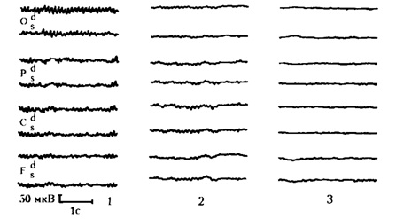 ЭЭГ взрослого человека в состоянии бодрствования: регулярный а-ритм, модулированный в веретена, лучше всего выражен в затылочной области; реакция активизации на вспышку света (указатель раздражения на нижнем канале). 2. Бета (р)-ритм. Частота - 14-40 колебаний в 1 с, амплитуда - до 15 мкВ. Лучше всего этот ритм регистрируется в участке передних центральных извилин.