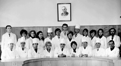 Профессор Штаркер В.А. с сотрудниками в 1931 году. Осенью 1926 г. на должность заведующего кафедрой был избран профессор Вячеслав Анатольевич Штаркер. Изучались проблемы краевой патологии: нейробруцеллез, клещевой энцефалит совместно с институтом природно-очаговых инфекций, омская геморрагическая лихорадка, а также проблемы эпилепсии и лечения нервных болезней. Совершенствовалась методика преподавания. С января 1952 г. заведование кафедрой было поручено доценту Владимиру Александровичу Зудову. Новые страницы в истории развития кафедры связаны с приездом в Омск Заслуженного деятеля науки, профессора Николая Ивановича Савченко (1953-1970). Под его влиянием происходит становление нейрохирургической службы в Омске; изучаются проблемы профессиональной патологии в условиях нефтеперерабатывающих производств и нефтехимической промышленности; получают новое звучание лечебно-оздоровитель-ные мероприятия в условиях местных санаториев.
