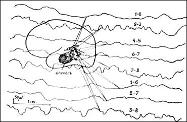 Рис. 12. ЭКоГ больного с опухолью височной доли. Регистрация потенциалов непосредственно с поверхности мозга носит название электрокортикография (ЭКоГ). Она осуществляется посредством наложения электродов на мягкую мозговую оболочку полушария мозга или мозжечка во время нейрохирургической операции с целью уточнения локализации очагового патологического процесса (эпилептический очаг, опухоль, абсцесс и др.).