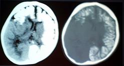 Рис. 34 (а,б). а) КТ-граммы больной В-ой 15 лет, которой выполнено внутреннее дренирование посттравматической кисты. Объем ликворных пространств до операции 76см³; б) после операции объем ликворных пространств 59 см³. Преимущества метода: позволяет визуализировать любые внутренние органы человеческого тела, оценивать кровоснабжение органов; получать 3-мерные изображения зоны исследования. Для дифференциальной диагностики сосудистых, опухолевых заболеваний и травматического поражения головного мозга применяется контрастное усиление (внутривенное введение йодсодержащих контрастных препаратов). Методики внутривенного контрастного усиления позволяют уточнить характер выявленных патологических изменений (определить наличие объемного образования – опухоли, предположить гистологическую принадлежность) на фоне окружающих их мягких тканей, а также визуализировать изменения, не выявляемые при обычном («нативном») исследовании. Исследование КТ – грамм головного мозга проводится с определением локализации очага, его размеров и объема, наличия масс-эффекта, выраженности отека и наличия дислокационного синдрома. При острых нарушениях мозгового кровообращения (ОНМК) ишемического характера выявляются очаги пониженной плотности через 14-20 часов от начала заболевания. При геморрагических инсультах выявляются очаги повышенной плотности с первых часов формирования гематомы, при ОНМК смешанного характера нередко на фоне очага пониженной плотности выявляется формирующаяся гематома или зона геморрагического пропитывания более высокой плотности. Опухоли головного мозга менингососудистого ряда (менингиомы и др.) выглядят участками высокой плотности от +35 до 50 ед. Н (ед. Н – единица Хоунсфилда). Признаками глиальных опухолей является наличие очагов пониженной плотности с нечеткими, неровными краями, и в ряде случаев имеются включения повышенной плотности. КТ-признаками абсцесса головного мозга является наличие образования пониженной плотности округлой или неправильной формы (при множественных абсцессах). При КТ-исследовании головного мозга хорошо визиализируются желудочковая система головного мозга, субарохноидальные пространства.