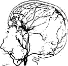 Задняя черепная ямка – содержит мост, продолговатый мозг, мозжечок, поперечную, сигмовидную и затылочную пазухи. Отверстия зад- ней черепной ямки: porus acusticus internus ((внутреннее слуховое отверстие) – пропускает a. labyrinthi, n. facialis (VII), n. statoacusticus (VIII), n. intermedius); foramen jugularis (пропускает n. glossopharyngeus (IX), n. vagas (X), n. accessorius willisii (XI), v. Jugularis interna); foramen magnum (проходит продолговатый мозг с оболочками, aa. Vertebralis, plexus venosi vertebrales interna, спинномозговые корешки n. accessorius); canalis hypoglossi (проходит n. hypoglossus). На обзорных краниограммах иногда четко определяются борозды артерий твердой мозговой оболочки. В ряде случаев гипертрофированные сосудистые борозды штопорообразной формы являются признаком опухолевого процесса. Наряду с выраженным рисунком борозд артерий твердой мозговой оболочки при опухолях головного мозга на краниограммах может выявляться отводящая венозная сеть в виде широких диплоэтических каналов. Объемные процессы, расположенные близко к поверхности мозга или эпидурально (опухоли, дермоиды, холестеотомы), могут вызывать на ранних этапах компрессионного воздействия на костные структуры «истончение» и в дальнейшем в костях черепа определяются деструктивные изменения с четкими контурами различной формы.