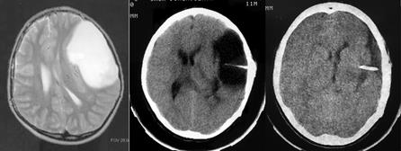 1 2 3 Рис. 49. МР-томограммы головного мозга пациента с кистой полушария головного мозга (1 – до операции, 2 – ранний послеоперационный период, 3 – спустя 3 месяца после операции).