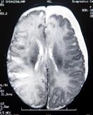 Рис.42. (а,б,с). а – МР-томограммы головного мозга пациента с герпетическим менингоэнцефалитом; б, в – МР-томограммы пациентов с гигантскими абсцессами головного мозга. Данный метод исследования позволяет проводить исследования при заболеваниях и травмах головного и спинного мозга (аномалии развития, нейроинфекции, демиелинизирующие заболевания и пр.). МРТ позволяет объективно оценивать степень тяжести черепно-мозговой травмы (в различные периоды течения), а также исследовать компенсаторные возможности внутричерепных «резервных» пространств, своевременно диагностировать развитие декомпенсации и осложнений. Проведение МРТ-исследования позволяет осуществлять дифференцированный подход (с учетом тяжести состояния пациента) к тактике ведения больных с черепно-мозговой и вертеброспинальной травмой, принимать обоснованное решение при выборе методов оперативного лечения.