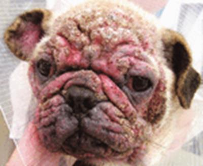 Рис 3 Фотография морды шестимесячного мопса с демодекозом. Видны выраженная алопеция, эритема, эрозии, язвы и корки.