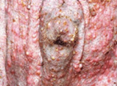 Рис 4 Фотография препуциальной зоны мопса с рис 3. Присутствуют алопеции, эритема, папулы, пустулы и корки.