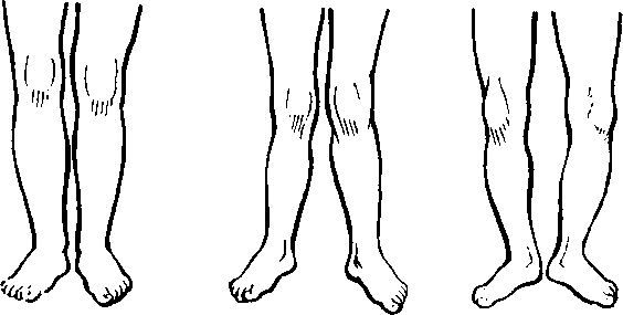 Различают три формы ног, которые отличаются взаимоположением оси бедра и голени: прямые ноги, х-образные, о-образные (рис. 7, а, б, в соответственно).