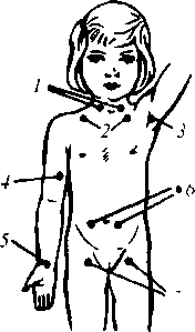 Приподнятое положение конечности. Применяется при венозном и капиллярном кровотечении, так как уменьшает кровенаполнение конечностей. Способы временной остановки артериальных кровотечений. Пальцевое прижатие главных артерий. Поврежденную артерию прижимают к близлежащей кости выше места ранения на конечности и туловище (рис. 12). При повреждении артерий шеи или головы сосуд прижимают ниже места повреждения (рис. 13). Например, сонную артерию прижимают к поперечным отросткам шейных позвонков или к внутреннему краю грудинно-ключично-сосцевидной мышцы. Максимальное сгибание или пере разгибание в суставах поврежденной конечно- Рис. 12. Места пальцевого прижатия кровоточащего сосуда. Например, при ранении подключичной артерии обе руки, согнутые локтях, максимально отводят назад и фиксируют в таком положении с помощью повязки, ремня и др.