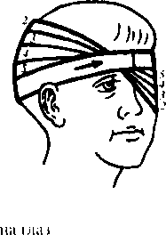 Повязки на различные части тела. Для бинтования головы удобна повязка, называемая чепец (рис. 16). Для наложения повязки требуется лента из бинта длиной около 1 м Середину ленты помещают на область темени, концы спускают вертикально вниз впереди ушей. Ребенок или помощник удерживает их в натянутом состоянии. Вокруг головы делается круговой виток, закрепляющий перекинутую ленту. При следующем витке делается петля вокруг свободного конца, бинт направляется на затылок, переходит на другую сторону головы и т.д., смещая бинт при каждом витке, полностью закрывают поверхность головы. Свободные концы завязывают под подбородком.