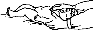 Оказывающий помощь (рис. 28) становится сбоку от ребенка и кладет ладонь одной руки на нижнюю треть грудины так, чтобы ладонь была перпендикулярна оси грудины. Ладонной поверхностью другой руки перпендикулярно надавливают на грудину, чтобы она прогибалась по направлению к позвоночнику на 3—4 см. При этом сердце сдавливается между грудиной и позвоночником, и кровь поступает в сосуды. У новорожденных и детей первого года жизни массаж сердца проводится двумя пальцами или одной рукой. Частота надавливаний на грудную клетку у новорожденных и грудных детей 100—200 раз в 1 мин. При этом смещение грудины должно быть в пределах 1,5—2 см. должен лежать на ровной жесткой поверхности на спине. Искусственное дыхание должно чередоваться с непрямым массажем сердца. При этом следует помнить, что на одно дыхательное движение приходится 4—5 сердечных сокращений. Начинать реанимационные мероприятия следует с ИВЛ: делают 4—5 дыхательных движений, после этого проводят 4—5 воздействий на сердце (НМС), а затем вновь 2 искусственных дыханий (ИВЛ). Таким образом, схема реанимации выглядит следующим образом: Начало реанимации => ИВЛ — НМС — ИВЛ — НМС — ИВЛ и т.д. 4—5 4—5 2 4—5 2 Проведение реанимационных мер позволяет сохранить кровоснабжение мозга до прибытия специалистов.