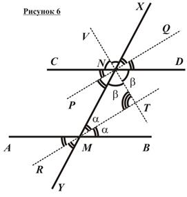 · Если прямые параллельны, то накрест лежащие углы, образованные при пересечении их секущей, равны (на рисунке 5 · Если прямые параллельны, то соответственные углы, образованные при пересечении их секущей, равны (на рисунке 5 · Если прямые параллельны, то односторонние углы, образованные при пересечении их секущей, в сумме составляют 180° (на рисунке 5 Следует различать признаки и свойства углов при параллельных прямых и секущей: если свойства справедливы в случае, когда прямые параллельны (углы при параллельных прямых обладают указанными выше свойствами), то признаки позволяют выяснить, являются ли прямые параллельными. Свойства и признаки называются взаимно обратными теоремами (то, что является причиной в свойстве, в признаке оказывается следствием, и наоборот). На рисунке 6 изображены биссектрисы углов, образованных при пересечении параллельных прямых AB и CD секущей XY. Пользуясь рисунком, докажем следующее свойство биссектрис углов, образованных при пересечении параллельных прямых секущей: Биссектрисы накрест лежащих или соответственных углов, образованных при пересечении двух параллельных прямых секущей, тоже параллельны. Биссектрисы односторонних углов, образованных при пересечении параллельных прямых секущей, взаимно перпендикулярны.
