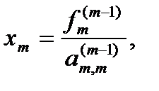 Эта процедура получила название обратный ход метода Гаусса. Метод Гаусса может быть легко реализован на компьютере. При выполнении вычислений, как правило, не интересуют промежуточные значения матрицы А. Поэтому численная реализация метода сводится к преобразованию элементов массива размерности (m×(m+1)), где m+1 столбец содержит элементы правой части системы. Для контроля ошибки реализации метода используются так называемые контрольные суммы. Схема контроля основывается на следующем очевидном положении. Увеличение значения всех неизвестных на единицу равносильно замене данной системы контрольной системой, в которой свободные члены равны суммам всех коэффициентов соответствующей строки. Создадим дополнительный столбец, хранящий сумму элементов матрицы по строкам. На каждом шаге реализации прямого хода метода Гаусса будем выполнять преобразования и над элементами этого столбца, и сравнивать их значение с суммой по строке преобразованной матрицы. В случае не совпадения значений счет прерывается. Один из основных недостатков метода Гаусса связан с тем, что при его реализации накапливается вычислительная погрешность. Для больших систем порядка m число действий умножений и делений близко к Для того чтобы уменьшить рост вычислительной погрешности применяются различные модификации метода Гаусса. Например, метод Гаусса с выбором главного элемента по столбцам, в этом случае на каждом этапе прямого хода строки матрицы переставляются таким образом, чтобы диагональный угловой элемент был максимальным. При исключении соответствующего неизвестного из других строк деление будет производиться на наибольший из возможных коэффициентов и, следовательно, относительная погрешность будет наименьшей. Существует метод Гаусса с выбором главного элемента по всей матрице. В этом случае переставляются не только строки, но и столбцы[1]. Использование модификаций метода Гаусса приводит к усложнению алгоритма увеличению числа операций и соответственно к росту времени счета. Поэтому целесообразность выбора того или иного метода определяется непосредственно программистом. Выполняемые в методе Гаусса преобразования прямого хода, приведшие матрицу А системы к треугольному виду позволяют вычислить определитель матрицы: