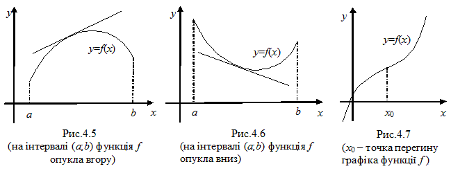 Інтервал (a; b), на якому графік функції y = f (x) опуклий вгору (опуклий вниз), а на будь-якому ширшому інтервалі вже не є опуклим вгору (опуклим вниз), називають інтервалом опуклості вгору (опуклості вниз) графіка функції f. Достатня умова опуклості вгору (опуклості вниз) графіка функції. Якщо Точку х 0 з області визначення функції, в якій змінюється характер опуклості графіка функції, називають точкою перегину графіка цієї функції (рис.4.7) У точках перегину дотична перетинає графік функції. Точки з області визначення функції f, в яких Достатня умова існування точки перегину графіка функції. Якщо x 0 – критична точка другого роду функції f і при переході через цю точку