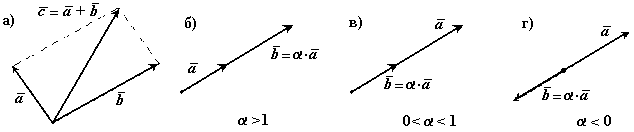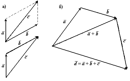 В математике все вектора являются свободными, их можно переносить параллельно самим себе. В сумме двух векторов (рис.1, а) начало второго вектора можно поместить в конец первого вектора, тогда сумму двух векторов можно представить как вектор, имеющий начало в начале первого вектора, а конец в конце второго вектора. Применяя это правило для суммы нескольких векторов (рис.1, б) получаем, что суммой нескольких векторов является вектор замыкающий ломаную линию, состоящую из слагаемых векторов. Операции над векторами подчиняются следующим законам (см. рис.2):