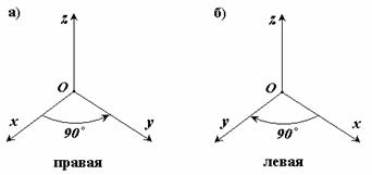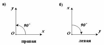 2. Правые и левые системы координат. Декартовы системы координат делятся на два вида: правую и левую. Рассмотрим декартовы системы координат на плоскости (см. рис. 3). При повороте оси Ox правой системы координат на 90о против часовой стрелки она совпадает с осью Oy.