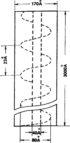 Рис. 7. Вирус табачной мозаики – первый вирус, который был описан и затем выделен в чистом виде. Вверху слева – схема строения (размеры здесь и далее даются в ангстремах – стомиллионных долях сантиметра). Справа – фотография модели вируса – однонитчатая спираль РНК в шубе из одинаковых молекул белка. Каждую такую белковую молекулу слагают в определенной последовательности 158 аминокислот.